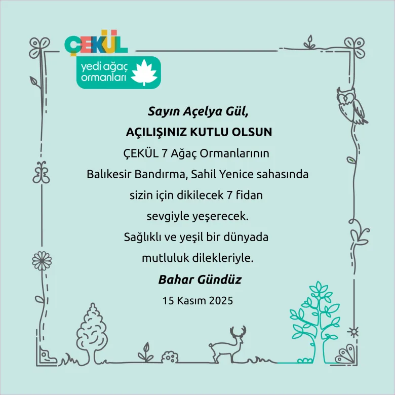 Güncel sahamız Balıkesir Bandırma, Sahil Yenicede konumlanan ÇEKÜL 7 Ağaç Ormanlarında fidanlarınızın boy vermesini istiyorsanız, kendiniz ya da sevdikleriniz adına 2, 3, 5 fidan ya da 7 ve katları ile fidan bağışı yapabilir, isme hazırlanan bağış kartı ile kendinize ya da sevdiklerinize fidan bağışı armağan edebilirsiniz.