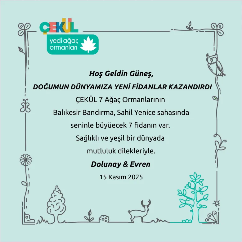Güncel sahamız Balıkesir Bandırma, Sahil Yenicede konumlanan ÇEKÜL 7 Ağaç Ormanlarında fidanlarınızın boy vermesini istiyorsanız, kendiniz ya da sevdikleriniz adına 2, 3, 5 fidan ya da 7 ve katları ile fidan bağışı yapabilir, isme hazırlanan sertifika ile kendinize ya da sevdiklerinize fidan armağan edebilirsiniz.